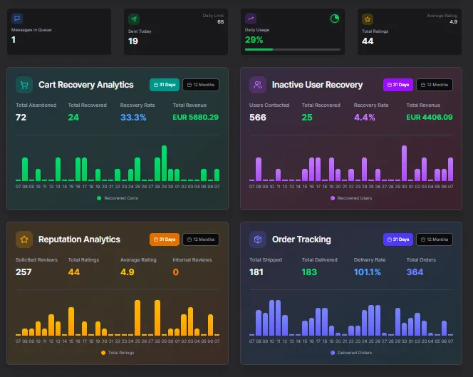 Dopo che un ordine viene segnato come "consegnato", econtact contatta il cliente nel suo momento di massima soddisfazione per chiedere una recensione. Costruisci la tua reputazione online e aumenta la fiducia dei nuovi visitatori, trasformando i clienti felici nei tuoi migliori venditori.