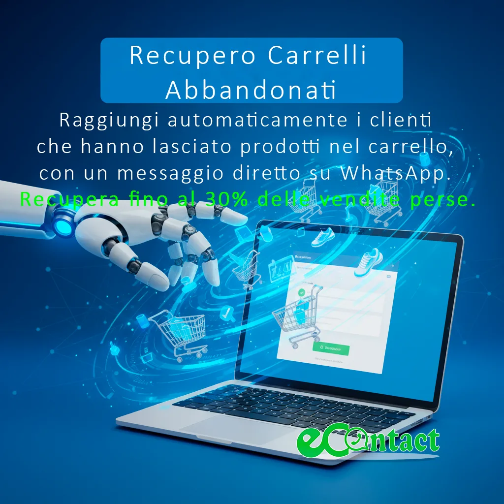 Non appena un cliente abbandona un carrello, econtact se ne accorge e invia un promemoria amichevole su WhatsApp. È il modo più efficace per trasformare un'esitazione in una vendita conclusa, recuperando fino al 25% del fatturato che altrimenti andrebbe perso.